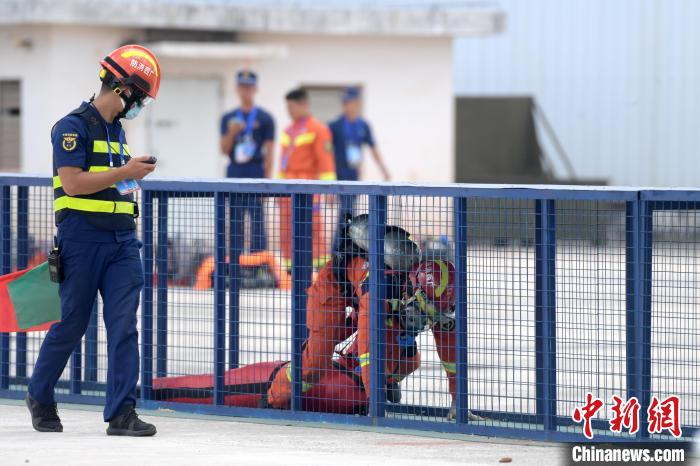 圖為應(yīng)急救援員進行綜合救助項目比拼,穿越籠道轉(zhuǎn)運假人。 俞靖 攝