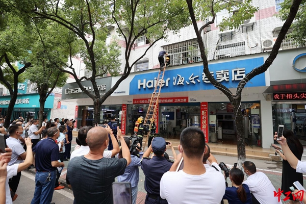 現(xiàn)場模擬火災(zāi)時,被困人員從“逃生窗”逃離火場