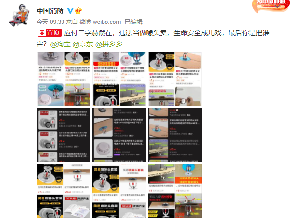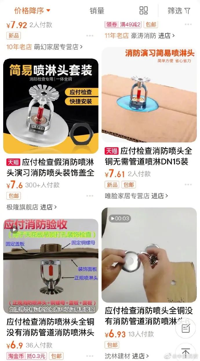 網(wǎng)購平臺(tái)售賣假消防物品,還有買家秀,淘寶、京東和拼多多平臺(tái)上,多家店鋪因售賣名為,“應(yīng)付檢查假消防噴淋頭”的物品。被@中國消防點(diǎn)名批評(píng): “應(yīng)付二字赫然在,違法當(dāng)做噱頭賣,生命安全成兒戲,最后你是把誰害?”