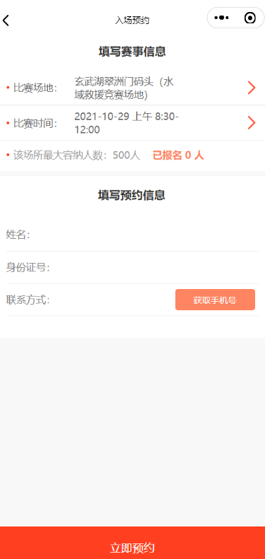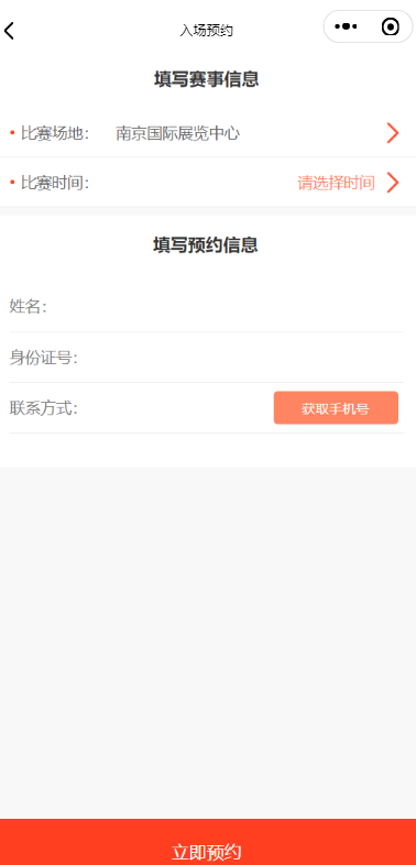在小程序頁面點(diǎn)擊“預(yù)約觀賽”,進(jìn)入入場(chǎng)預(yù)約頁面填寫相關(guān)信息。