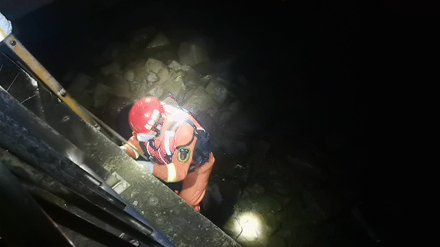 消防員火速到達現(xiàn)場,架設掛鉤梯,爬下去給其帶好頭盔,用安全繩將他綁在多功能救援擔架上,安全護送上岸。