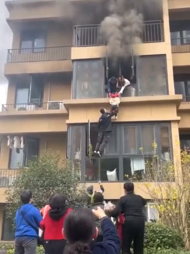 緊接著,他又用同樣的辦法,幫助兩名被困的成年人,安全轉(zhuǎn)移到2樓的居民家中。