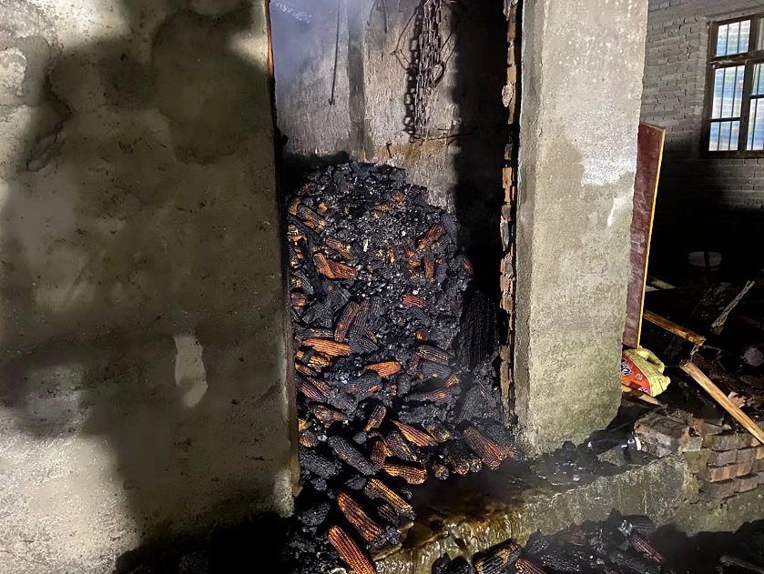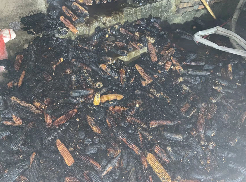 據(jù)戶主介紹,他在烤煙房內(nèi)熬制豬食后,將玉米棒丟在未完全熄滅的火內(nèi)離開,導(dǎo)致火星引燃玉米起火。