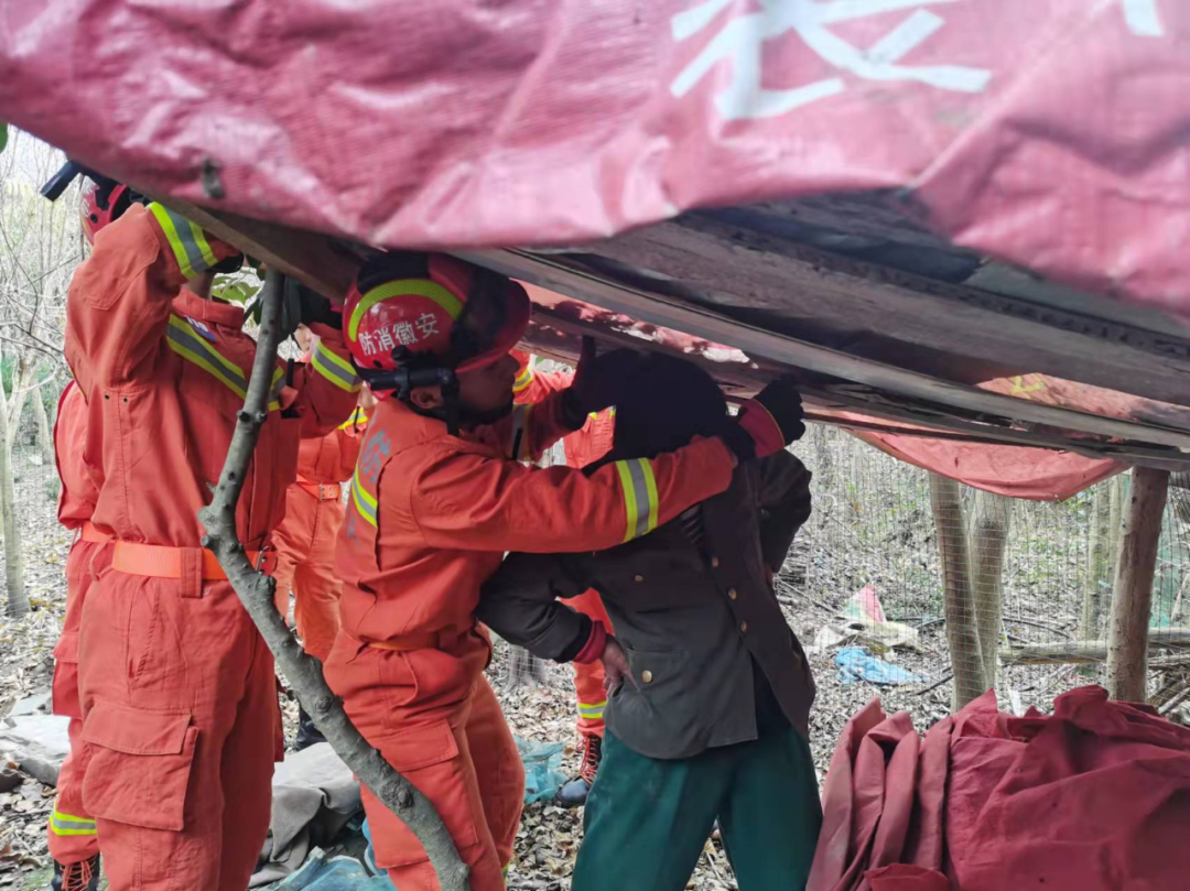 為減輕頭頂木板的重量,消防員仔細(xì)觀察現(xiàn)場情況后,隨即對棚子上的其他木板進(jìn)行拆除。