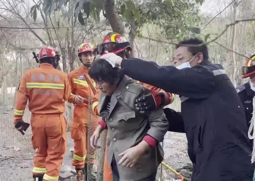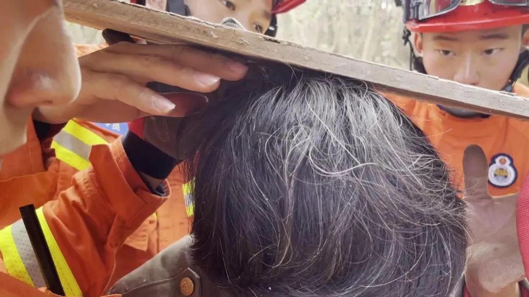 兩名消防員分左右兩側(cè)協(xié)力攙扶住她,防止在拆除木板的過程中釘子對其頭部造成二次傷害。