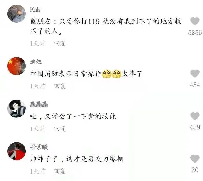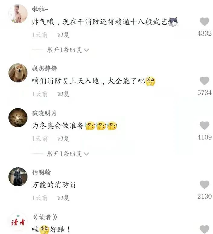 網(wǎng)友紛紛評(píng)論:“滑雪救援是救援中的天花板吧”、“藍(lán)朋友的技能多多!武藝高超!”、“消防員太全能了吧”。