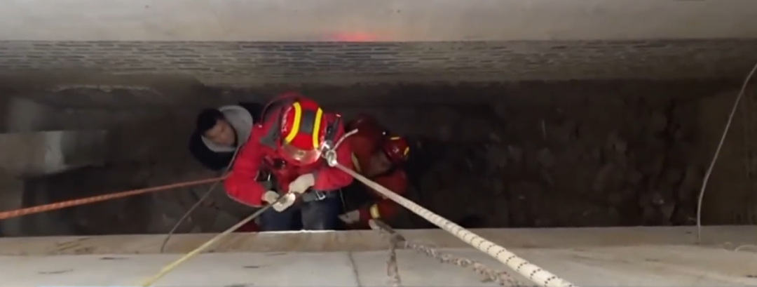 一名消防員通過繩索下到井下確認情況,一名急救醫(yī)生對傷者做好檢查并固定好后,地面消防員合力將傷者營救上來。