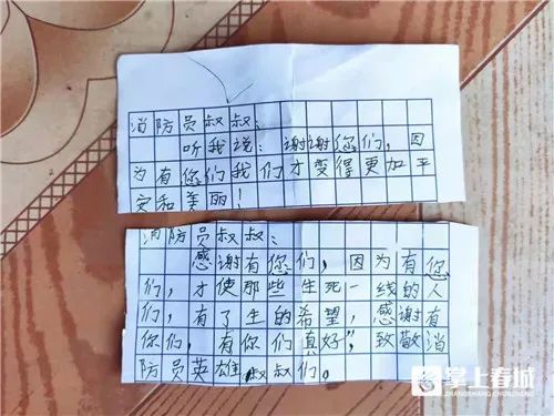 “當(dāng)時(shí)我們正在寧蒗縣永寧鎮(zhèn)八瓦村給他們家搭建帳篷,小女孩過(guò)來(lái)拉了一下我的衣角說(shuō),叔叔給。我問是什么?小女孩又重復(fù)了一遍:叔叔給?!痹颇鲜〕壑菹谰仍ш?duì)消防員何震打開紙條,上面寫著:“消防員叔叔聽我說(shuō):謝謝您們,因?yàn)橛心鷤兾覀儾抛兊酶悠桨埠兔利?.....”何震原本疲憊的身體在看到小女孩的紙條后,瞬間干勁十足。