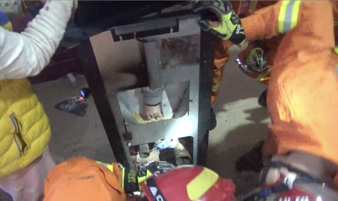 到達(dá)現(xiàn)場后,消防員發(fā)現(xiàn)孩子整條胳膊都伸進(jìn)了爐子進(jìn)料口,由于看不見爐子內(nèi)部具體情況,消防員隨即從側(cè)面,對取暖爐進(jìn)行破拆。