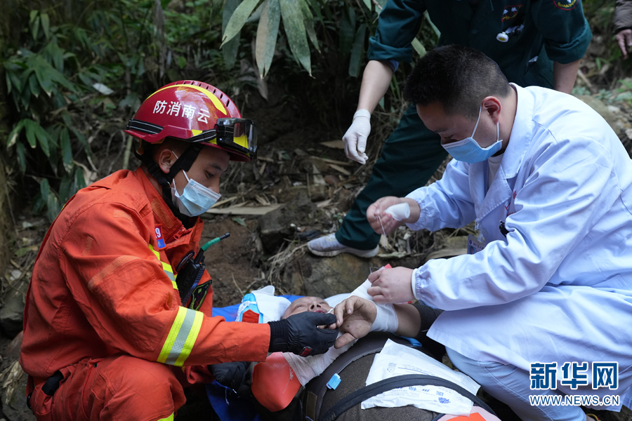 圖為消防救援人員協(xié)助醫(yī)務(wù)人員包扎傷者(2月7日攝)。新華網(wǎng)發(fā)(張子棟 攝)