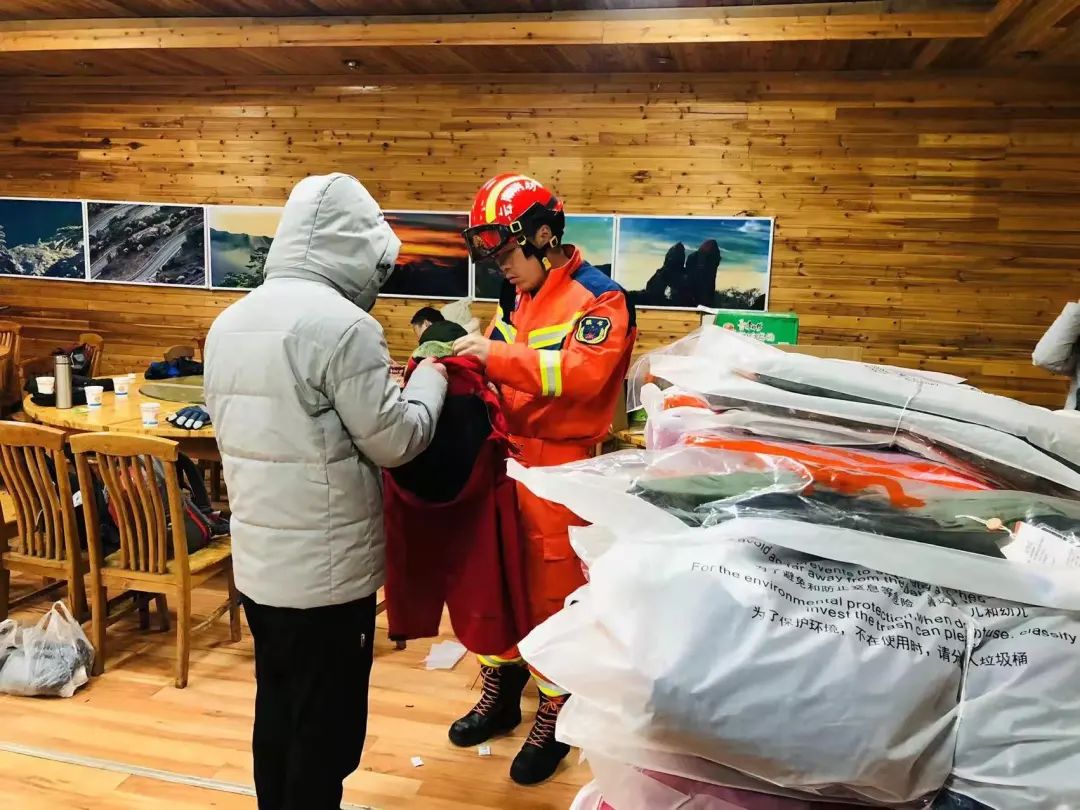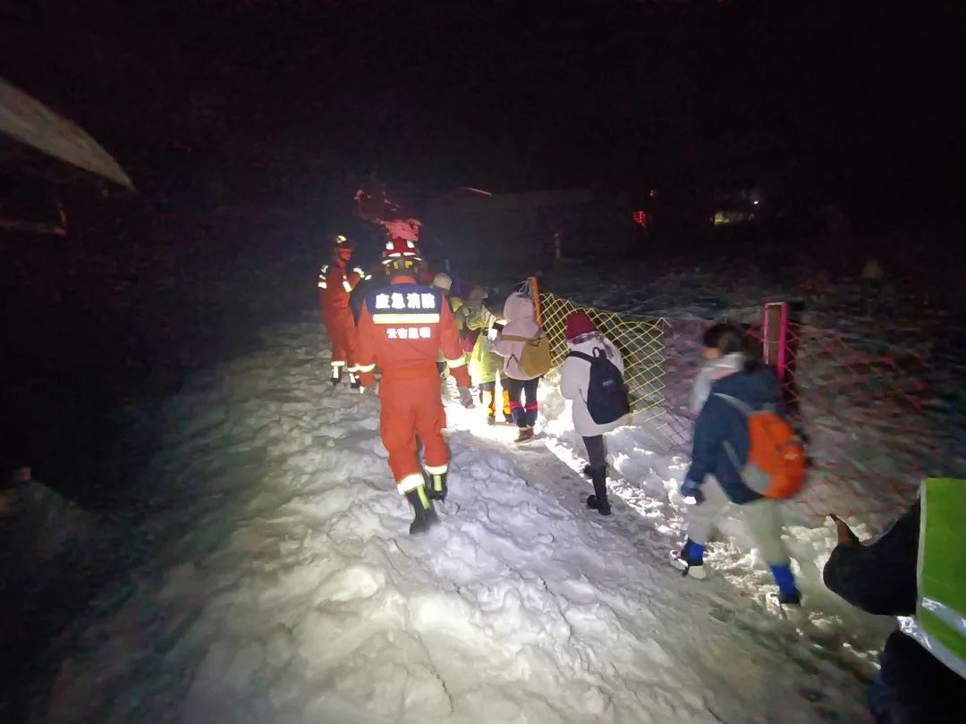 第一組救援人員在景區(qū)索道下站設(shè)置轉(zhuǎn)運(yùn)點(diǎn),備齊防寒保暖、飲食保障物資、氧氣瓶及轉(zhuǎn)運(yùn)車輛;