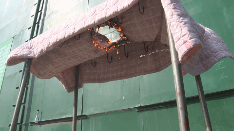 大約1分鐘后,被子出現(xiàn)明火,且被燒出一個洞。