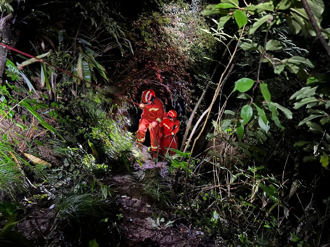 由于消防車輛無法上山,消防員攜帶救援繩索、擔(dān)架、醫(yī)療物品、照明裝備等,沿著懸崖邊,徒步找尋群眾被困位置。該區(qū)域雜草叢生、巖石陡峭,不時有石塊滾落,給冒雨救援的消防員帶來諸多困難。