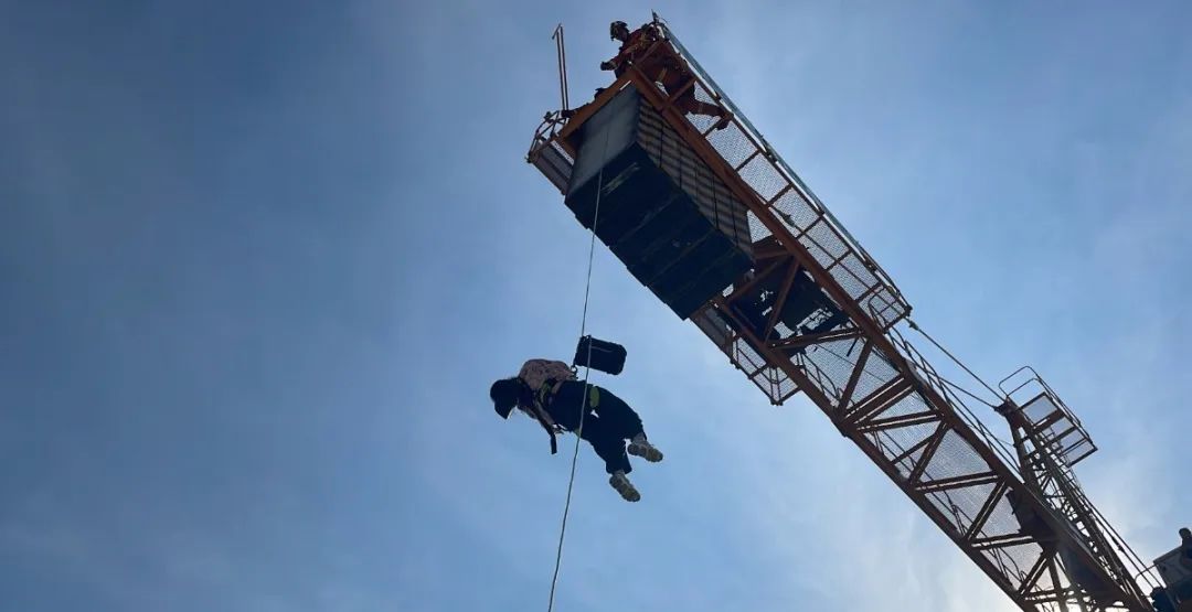 隨后,專業(yè)操作員調(diào)整塔吊方向,消防員利用已準備好的繩索救援設備,將工人先順利轉(zhuǎn)移到了一棟臨近的建筑物樓頂平臺。