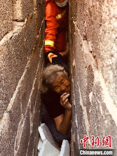 中新網(wǎng)桂林9月6日電(周亮)9月6日上午,廣西桂林市灌陽(yáng)縣文市鎮(zhèn)上堂屋屯一名90歲老人被困在僅有30厘米的墻縫中,當(dāng)?shù)叵谰仍块T接警后立即趕赴現(xiàn)場(chǎng)處置。