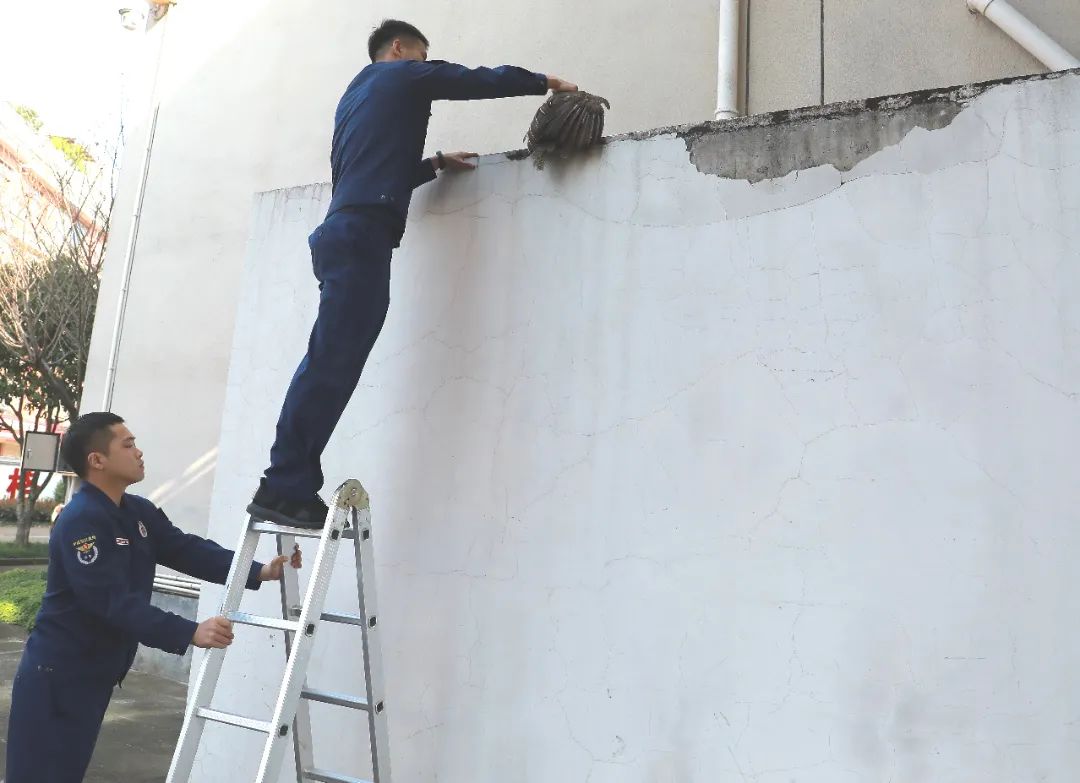 收到“求救信號”后,消防員搬來梯子爬上平臺,發(fā)現(xiàn)這只孔雀的頭部血跡斑斑,羽毛也有幾根掉落,明顯受了傷。消防員小心翼翼地把孔雀救下,帶到安全地帶,第一時間聯(lián)系了林業(yè)部門的專業(yè)人士。