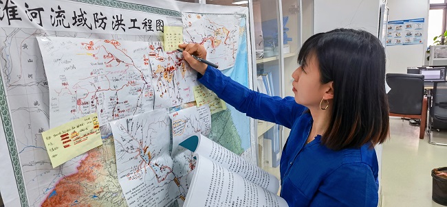 一方面,她研究大江大河歷史洪水和水利工程、國(guó)家防汛抗旱方案預(yù)案、防洪相關(guān)法律和規(guī)章制度。為了加強(qiáng)記憶,她把淮河干支流主要河道及重點(diǎn)防洪工程、蓄滯洪區(qū)的關(guān)鍵信息在白紙上用彩筆繪出,形成一幅幅精美的手工地圖,貼在工位周邊的擋板上。