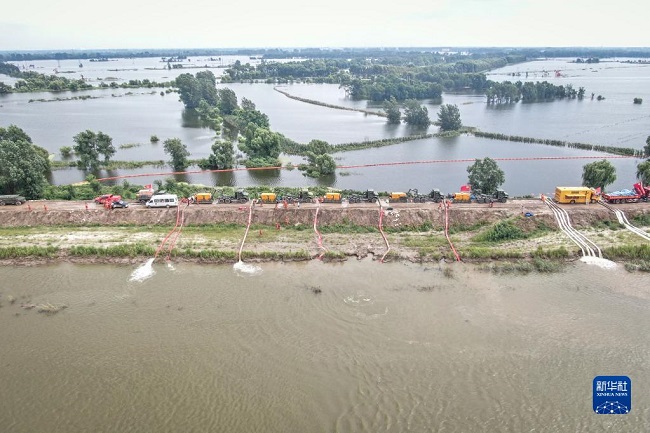 8月7日,搶險(xiǎn)人員在遼寧盤錦繞陽河左岸曾經(jīng)的河堤潰口北段進(jìn)行排澇作業(yè)(無人機(jī)照片)。