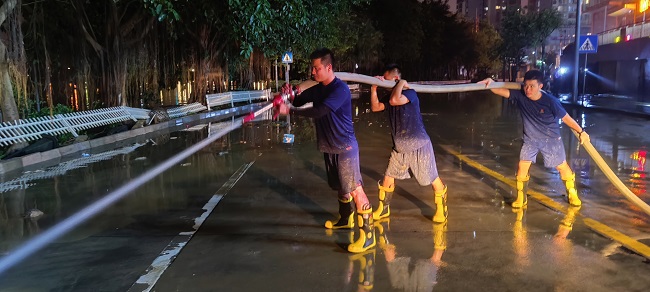 2022年6月7日凌晨,廣西壯族自治區(qū)柳州市洪水退卻后,何博(左一)和隊(duì)員們?cè)诮鹕辰沁B夜奮戰(zhàn)清理淤泥。