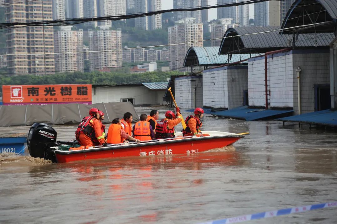 2020年8月,消防員在菜園壩水果市場轉移搜救被困人員。