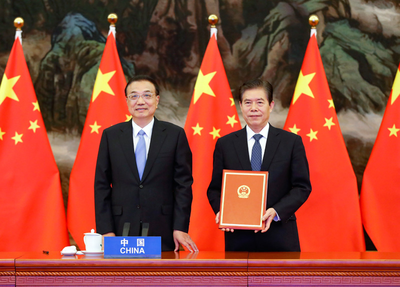會(huì)議結(jié)束后,李克強(qiáng)與各國領(lǐng)導(dǎo)人共同出席并見證RCEP簽字儀式,商務(wù)部長鐘山代表中國在協(xié)定上簽字。