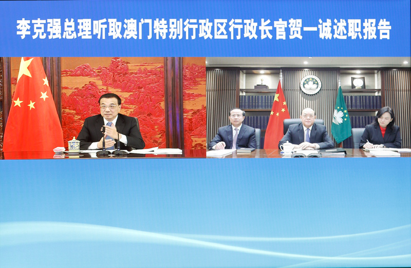 國務(wù)院總理李克強(qiáng)1月27日上午在中南海紫光閣以視頻連線方式聽取澳門特別行政區(qū)行政長官賀一誠2020年度的述職報(bào)告。賀一誠匯報(bào)了澳門特別行政區(qū)政府過去一年工作和當(dāng)前形勢。