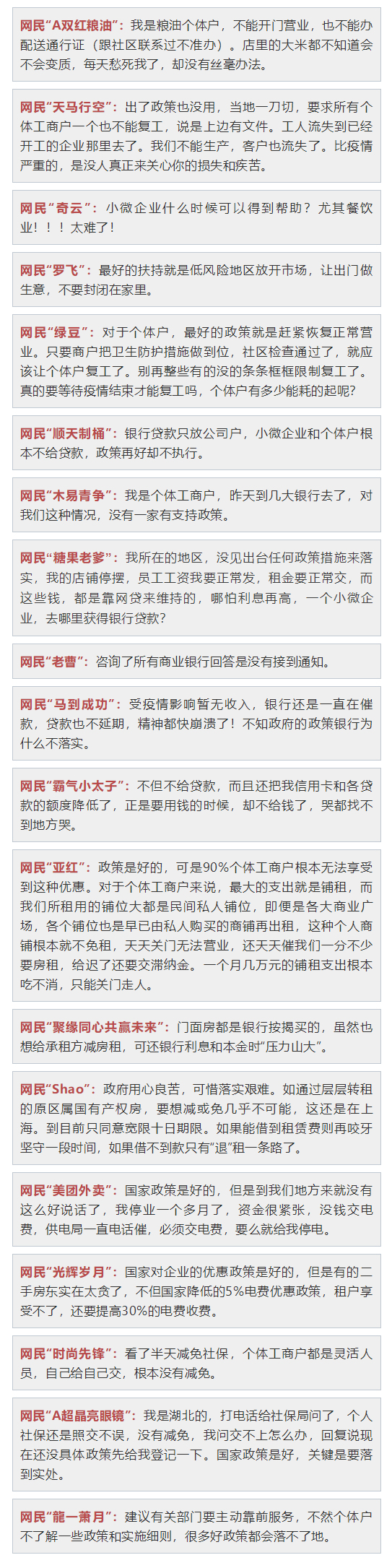 各項政策密集出臺后,中國政府網(wǎng)收到許多網(wǎng)友留言點贊,“國家給個體戶優(yōu)惠政策送來了!”“我們現(xiàn)在缺的就是錢,低息和免息最好的政策”“都是實打實的惠民福利??!”“政策真好,希望執(zhí)行到各個市縣”“我大武漢的小公司有救了”……在稱贊這些政策為小微企業(yè)和個體戶減負的同時,網(wǎng)友也反映了政策落地不夠快、配套措施不夠細、地方執(zhí)行不夠實等問題。