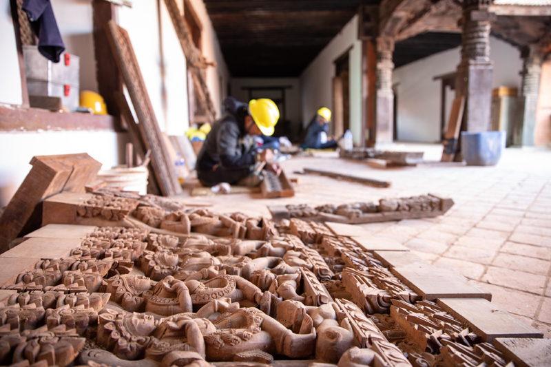 九層神廟位于“加德滿都谷地”世界文化遺產(chǎn)核心區(qū)。2015年,九層神廟在尼泊爾大地震中損毀,兩年后迎來(lái)中國(guó)文物修復(fù)專家。疫情以來(lái),中國(guó)專家克服醫(yī)療條件、采購(gòu)材料、組織工人等方面的困難,基本完成九層神廟建筑群文物建筑主體修繕。
