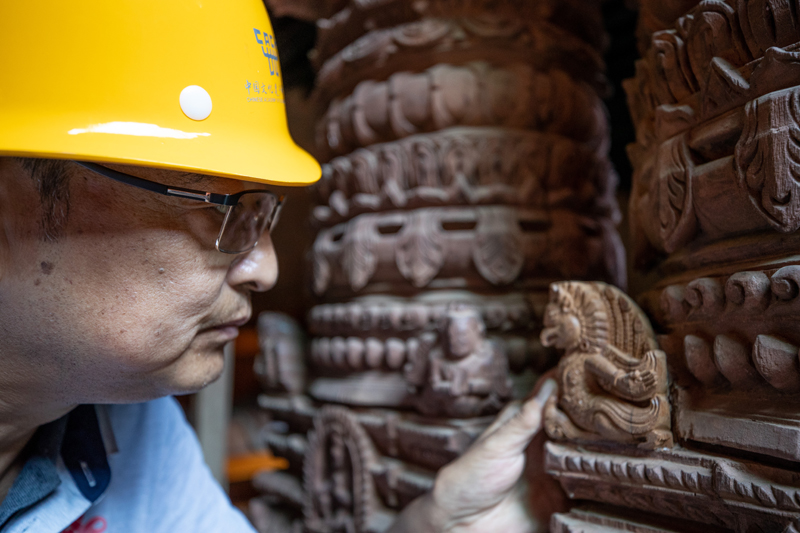2019年10月10日,在尼泊爾加德滿都杜巴廣場(chǎng),中國(guó)派出的文物修復(fù)隊(duì)技術(shù)主管周建國(guó)在九層神廟修復(fù)現(xiàn)場(chǎng)查看一個(gè)修復(fù)好的文物。新華社記者 王婧嬙 攝