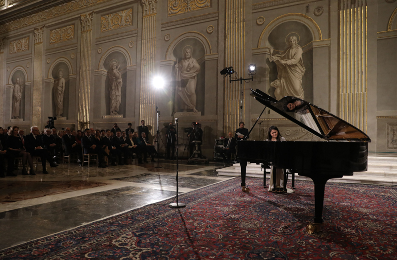 2020年2月13日,在意大利羅馬總統(tǒng)府奎里納萊宮,旅意華人鋼琴家居覲在音樂(lè)會(huì)現(xiàn)場(chǎng)演奏。當(dāng)日,由意大利總統(tǒng)馬塔雷拉提議,在2020年中意文化旅游年計(jì)劃外加演的一場(chǎng)鋼琴獨(dú)奏音樂(lè)會(huì)在意大利總統(tǒng)府舉行,向抗擊新冠肺炎疫情的中國(guó)人民傳達(dá)友誼和支持。新華社記者 程婷婷 攝