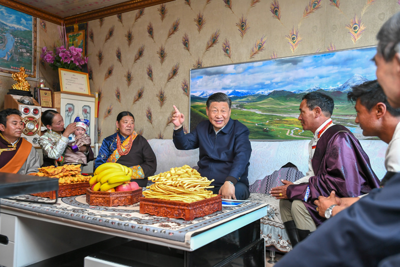 6月7日至9日,中共中央總書(shū)記、國(guó)家主席、中央軍委主席習(xí)近平在青??疾?。這是8日下午,習(xí)近平在海北藏族自治州剛察縣沙柳河鎮(zhèn)果洛藏貢麻村,同藏族牧民索南才讓一家人圍坐在客廳聊家常。新華社記者 謝環(huán)馳 攝