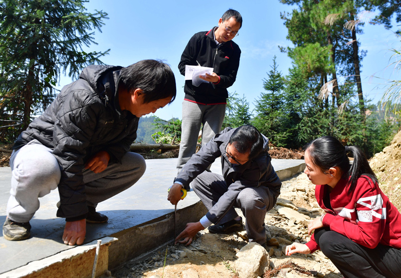 2019年11月5日,在廣西柳州市融水苗族自治縣良寨鄉(xiāng)培洞村,紀(jì)檢監(jiān)察干部(右一、二、三)在檢查扶貧道路施工情況。新華社記者 黃孝邦 攝
