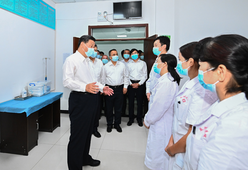 7月12日至15日,中共中央總書記、國家主席、中央軍委主席習(xí)近平在新疆考察。這是14日,習(xí)近平在吐魯番市高昌區(qū)亞爾鎮(zhèn)新城片區(qū)新城西門村黨群服務(wù)中心醫(yī)務(wù)室考察。新華社記者 燕雁 攝
