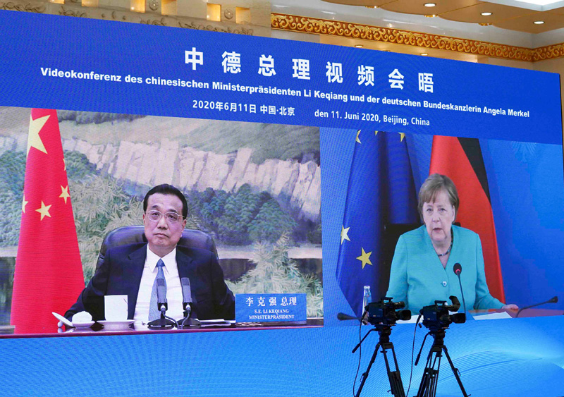 國務(wù)院總理李克強6月11日下午在人民大會堂同德國總理默克爾舉行視頻會晤。