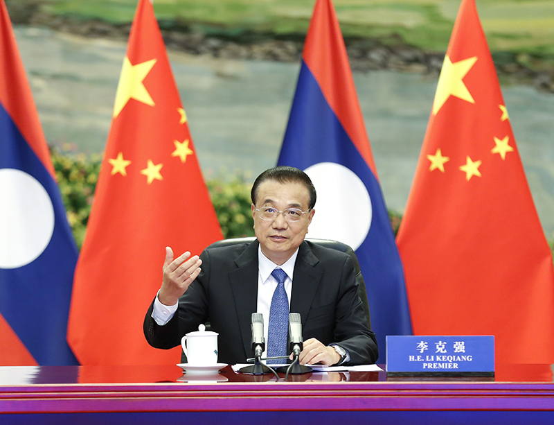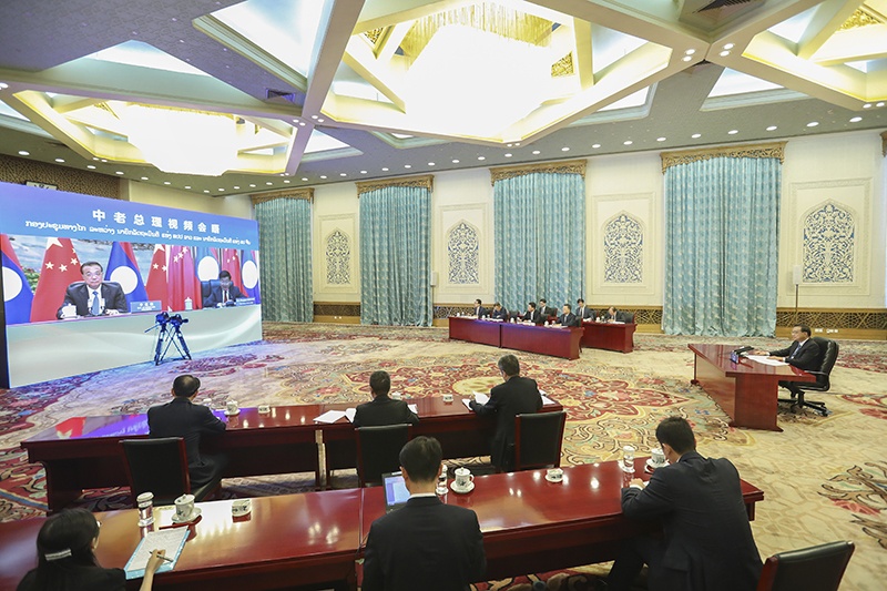 國務(wù)院總理李克強(qiáng)7月21日下午在人民大會堂應(yīng)約同老撾總理通倫舉行視頻會晤。