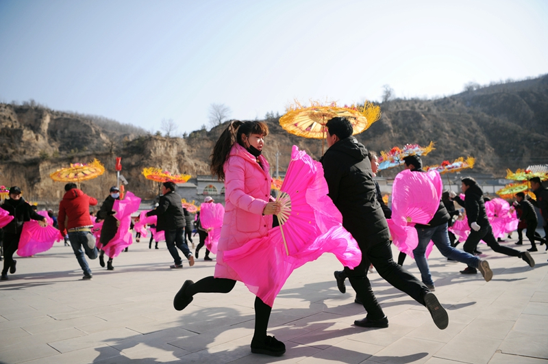 陜西延川文安驛鎮(zhèn)梁家河村村民在排練秧歌(2018年2月8日攝)。新華社發(fā)(張博文 攝)