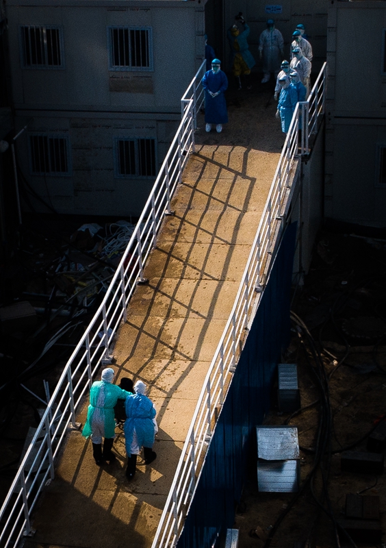 醫(yī)護(hù)人員將患者送入武漢火神山醫(yī)院病房(2020年2月4日攝,無(wú)人機(jī)照片)。新華社記者 肖藝九 攝