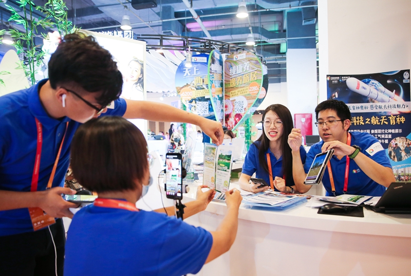 在2020年中國(guó)國(guó)際服務(wù)貿(mào)易交易會(huì)旅游服務(wù)專題展區(qū),中國(guó)旅游集團(tuán)展位的工作人員通過(guò)直播向線上觀眾介紹旅游服務(wù)產(chǎn)品(2020年9月5日攝)。新華社記者 潘思危 攝