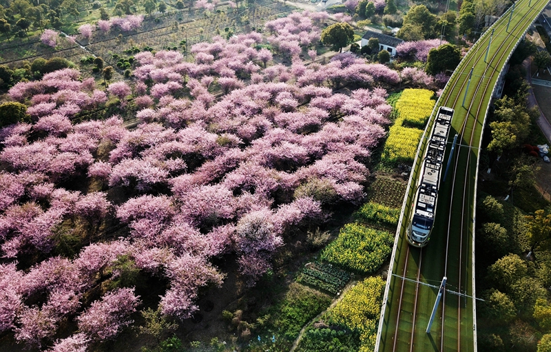 在江蘇蘇州高新區(qū),一輛有軌電車從一片盛開的垂絲海棠旁駛過(guò)(2018年3月28日攝)。新華社發(fā)(徐志強(qiáng) 攝)