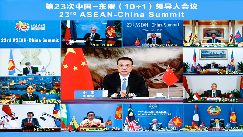 國務(wù)院總理李克強11月12日下午在人民大會堂出席第23次中國—東盟(10+1)領(lǐng)導(dǎo)人會議。東盟輪值主席國越南總理阮春福、泰國總理巴育、菲律賓總統(tǒng)杜特爾特、文萊蘇丹哈桑納爾、印尼總統(tǒng)佐科、馬來西亞總理穆希丁、新加坡總理李顯龍、老撾總理通倫、柬埔寨副首相昂蓬莫尼羅、緬甸國際合作部部長覺丁與會。李克強與阮春福共同主持會議。會議以視頻形式舉行。