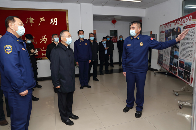 北京市西城區(qū)消防救援支隊(duì)府右街特勤站北望白塔、南依長安街,地處首都政治核心區(qū),承擔(dān)著人民大會堂、天安門廣場等周邊區(qū)域7平方公里范圍內(nèi)滅火戰(zhàn)斗、搶險(xiǎn)救援等任務(wù)。執(zhí)勤備防的消防指戰(zhàn)員整齊列隊(duì),接受部黨委的慰問??吹酱蠹揖穸稊\、斗志昂揚(yáng),黃明十分欣慰地說,確保責(zé)任區(qū)平安無事,是踐行習(xí)近平總書記重要訓(xùn)詞精神、守護(hù)初心擔(dān)當(dāng)使命的具體要求,要落實(shí)到日復(fù)一日的堅(jiān)守和赴湯蹈火的行動中,努力為首都人民站好崗、守好夜。在特勤站食堂,消防指戰(zhàn)員正在包餃子,黃明走進(jìn)食堂與大家嘮起家常,并向大家一年來的辛勤付出表示感謝。