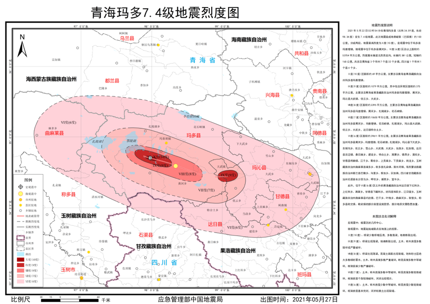 5月22日2時(shí)4分,青海果洛州瑪多縣發(fā)生7.4級(jí)地震。地震發(fā)生后,應(yīng)急管理部、中國(guó)地震局地震現(xiàn)場(chǎng)工作隊(duì)依照《地震現(xiàn)場(chǎng)工作:調(diào)查規(guī)范》(GB/T 18208.3-2011)、《中國(guó)地震烈度表》(GB/T 17742-2020),對(duì)災(zāi)區(qū)55個(gè)調(diào)查點(diǎn)展開(kāi)了實(shí)地震害調(diào)查,并參考震區(qū)斷裂構(gòu)造、余震分布、震源機(jī)制、儀器烈度分布等科技支撐成果,結(jié)合強(qiáng)震動(dòng)觀測(cè)記錄,確定了此次地震的烈度分布,完成了《青?,敹?.4級(jí)地震烈度圖》編制工作,并征求了青海省人民政府和有關(guān)州政府、住房和城鄉(xiāng)建設(shè)部意見(jiàn),現(xiàn)正式向社會(huì)公布。