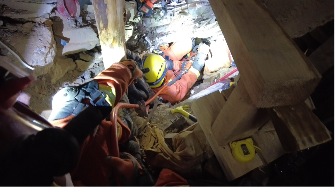 救援的過(guò)程并不輕松。8名攻堅(jiān)隊(duì)員只能輪流用角磨機(jī)、撬棍、斧頭、電動(dòng)剪這些小型工具,在廢墟中摸索著開(kāi)辟通道,一點(diǎn)一點(diǎn)地向前掘進(jìn)。他們都是被特意挑選的身形較小的消防員,人高馬大的干這個(gè)著實(shí)不便。通道最外面的洞口有七、八十厘米寬,但到了里面只能開(kāi)辟四、五十厘米寬,時(shí)間寶貴,客觀上不允許開(kāi)辟更寬闊的救援通道,不管你有幾個(gè)隊(duì)友,挺在最前面的只能是一個(gè)人。